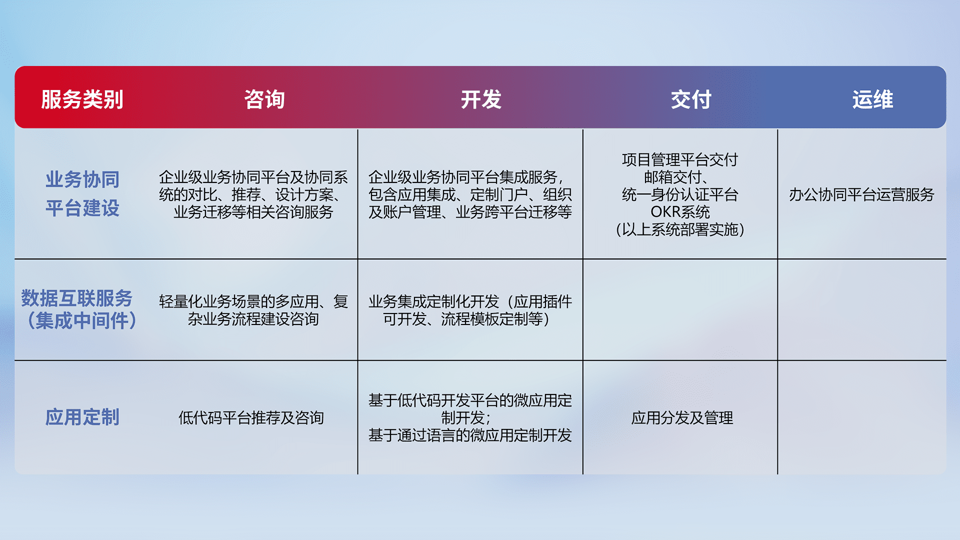 针对钉钉、、、企微、、、IDaas等平台级产品提供产品的规划、、、、方案、、交付、、、、定制化开发等服务,,实现如统一协同办公、、、智能客户服务、、混合会议管理、、智能数据查询、、、等业务场景,,,实现数字化转型。。。